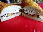 When you use a carving fork, which sometimes comes with a carving knife, you can hold the sandwich together while cutting it. The insides of the sandwich leak out because holding the sandwich down creates pressure. When you use a carving fork, the tines pierce everything simultaneously so the insides float against the tines and don’t leak out. It’s a wonderful thing.