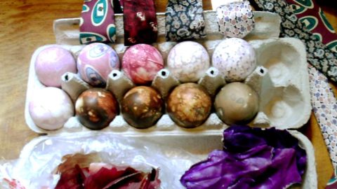 The one thing to remember about making silk tie dyed eggs is that you need to use real silk. If it’s not silk, the pattern will not transfer. I’ve tried. It should also be a good pattern that will show up on the eggs. For example, pink silk with a subtle pattern will just give you a solid pink egg. It will be pretty, but it’s not the same thing.